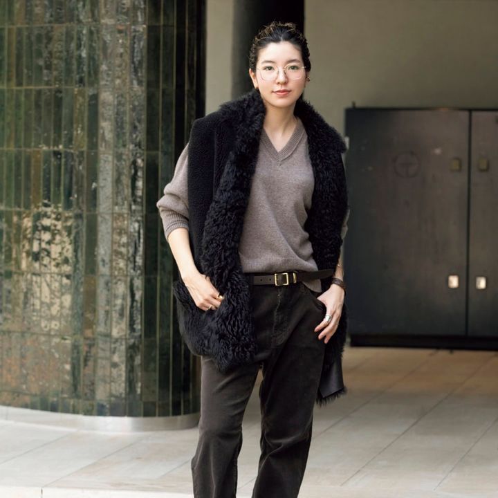 「ずっと愛用しているムートンベストに、上質なカシミアのVネックニットとコーデュロイパンツを合わせ、カジュアルにまとめました。ゴールドフレームの華奢な眼鏡でさり気なくツヤっぽさも意識」