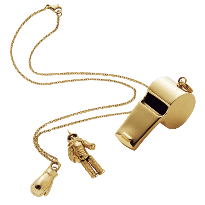 日本ではアパルトモンのみで取り扱うブランド。ホイッスルのペンダントトップ¥440,000、スペースマンのペンダントトップ¥583,000、グローブ付きペンダント¥407,000(全てイラリア イカルディ)