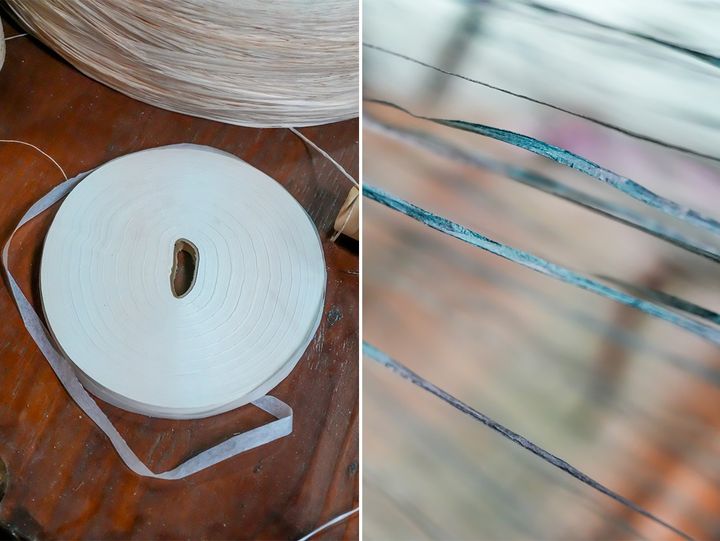 左:撚糸の原料となる和紙 右:引っ張っても切れない強度に和紙を機械で何度も撚っていく