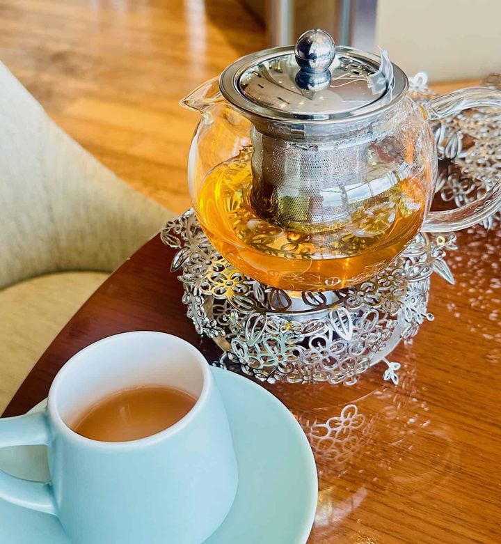 ティーポットはキャンドルで温めているので、いつでも温かい状態でいただけるのが嬉しい♡ 今の時期はオレンジアプリコットやピーチマスカットのシーズナルティーもメニューに登場。ドリンクは、フレンチプレスコーヒーや紅茶などから好きなだけいただけます。