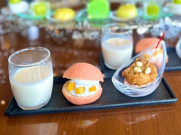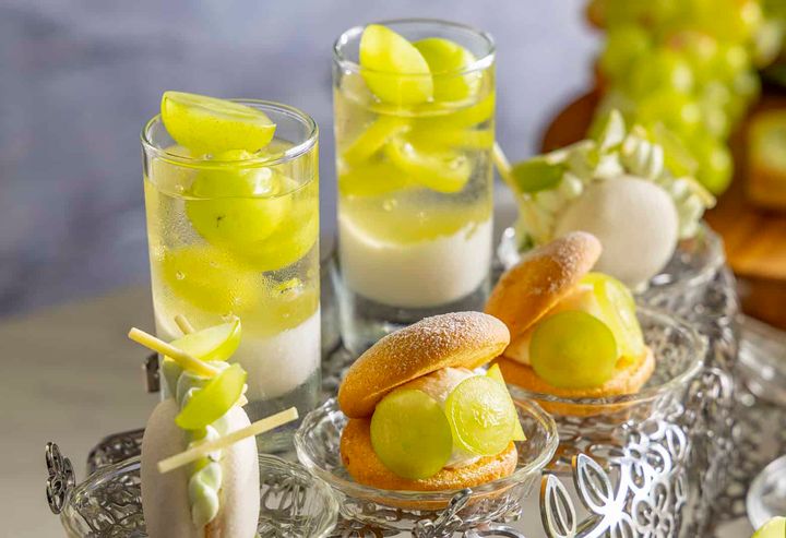 スイーツは全9種類。大粒なシャインマスカットの芳醇な甘さを生かした「ブッセ マリトッツォ風」や「洋風団子」、「テリーヌ」から、軽やかなシュー生地にジューシーな果肉を合わせた「シャインマスカットシュークリーム」、清涼感あるゼリーと杏仁豆腐のコントラストが美しい「シャインマスカットとブドウゼリー杏仁豆腐」まで、爽やかで華やかなスイーツが勢ぞろいしています。