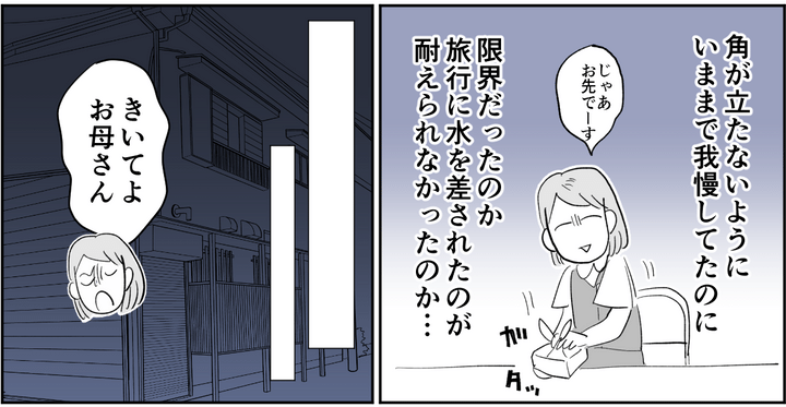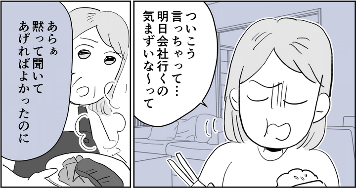 今日は旦那が会社の飲み会だというので、実家に夜ご飯を食べに行きました。山田さんの愚痴に耐えきれず、つい本心を言ってしまったことを母に話しました。母は山田さんの愚痴くらい聞いてあげたらいいのにと言います。