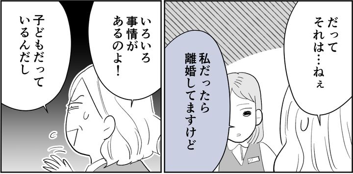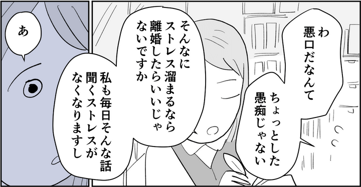 私・カナエ(26)の職場は、私語することにあまり厳しくない職場で、みんなで和気あいあいと楽しんで働いています。そんな雰囲気に水を差すのが山田(40代)さん。とにかく旦那さんの悪口しか言いません。どんな話でも旦那さんの悪口と結びつけてしまうのです。いつもは大人しく話を聞きますが、この日は私の新婚旅行にまでケチをつけられたように感じ、ついイラっとして「どうして離婚しないんですか?」と突っ込みを入れてしまったのです。山田さんはとても驚いた顔をしていました。