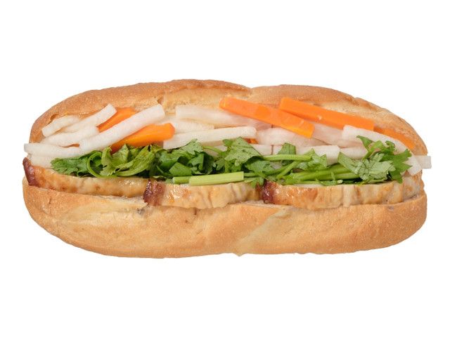 ローストチキンと、人参と大根のなます、パクチーを挟んだベトナム風サンドイッチです。スイートチリソースの味がアクセント。