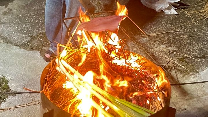 ご近所さんの庭には、なんと藁焼き台が置いてあった。せっかくなので、藁焼き体験をさせてもらうことに。