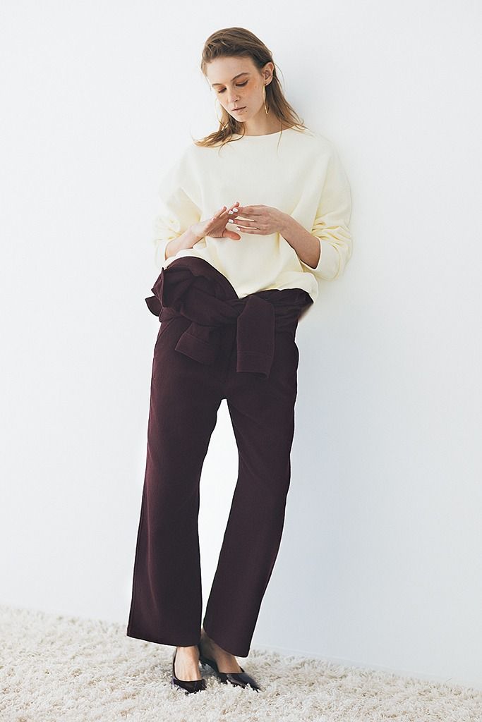 パステルイエローとボルドーのコントラストを生かしてボリュームのあるシルエットを引き締め。甘さが漂う暖色系でまとめたことにより、ボーイッシュに着くずしてもメンズに傾かない。