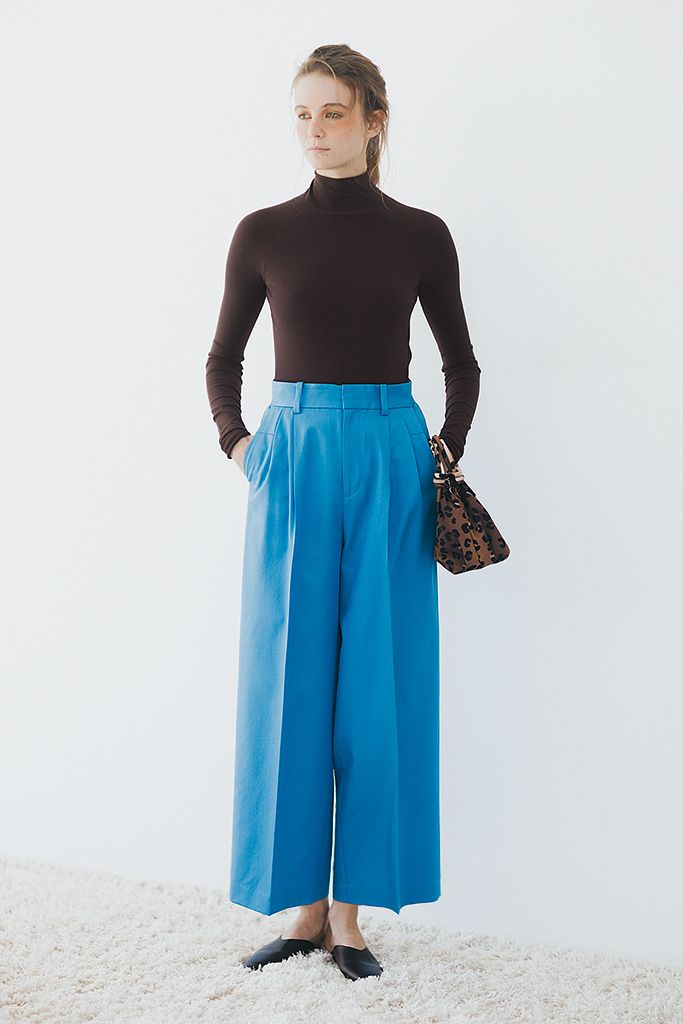 ブラウンのタートルトップスを軸に、ハンサムなスタイルが完成。寒色の中でもネイビーより発色のいいブルーを選ぶことで、クラシックなムードのまま、春に合う軽やかさが手に入る。