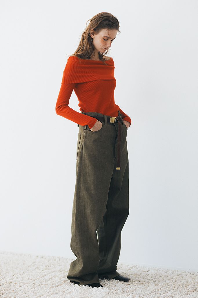 ブラウンの延長で使える熟れたオレンジはカーキと好相性。深くて味のある配色は、旬のオフショルダーでわかりやすく鮮度を維持。