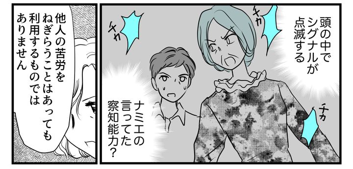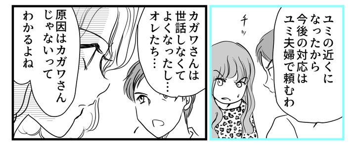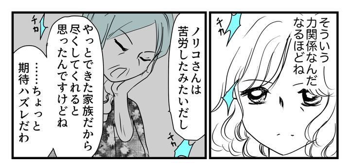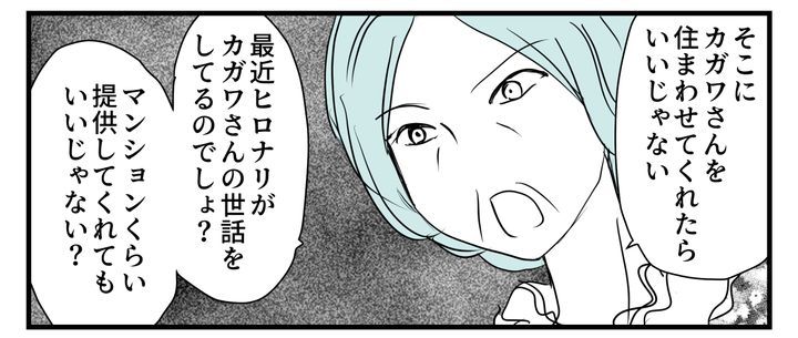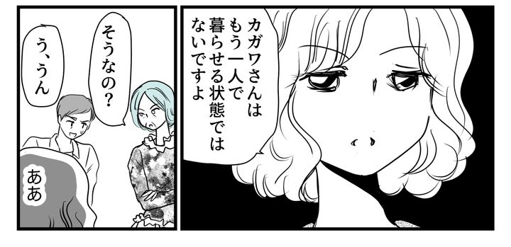 大家さんは私とヒロナリの両方に連絡していたようです。大家さんの焦った様子にヒロナリは「ただごとじゃない」と感じ、カガワさんの家へ行く前に義妹と義母にも状況を伝えていたと言います。義母は最近の私がカガワさんのお世話を拒否していることなども指摘してきました。義母とヒロナリの交わす短い会話の中で、2人の力関係が見えました。