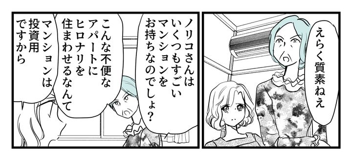 私(スズキノリコ、48歳)は幼い頃に両親を亡くし、施設で育ちました。外資系企業で仕事に励みながら不動産投資で資産を構築したのち、45歳で早期退職。その後夫(ヒロナリ、50歳)と結婚し、郊外へ転居しました。すると義妹(ユミ、42歳)から旦那さん(アツキ、45歳)の母(カガワ、79歳)が近所に住んでいるので世話してほしいと頼まれたのです。私がカガワさんの世話を拒否すると、義妹と義母(ユリエ、75歳)から責められ、ヒロナリとは言い合いになります。しかもヒロナリからトラブルを聞きつけたのか、義母が突然訪ねてきました。