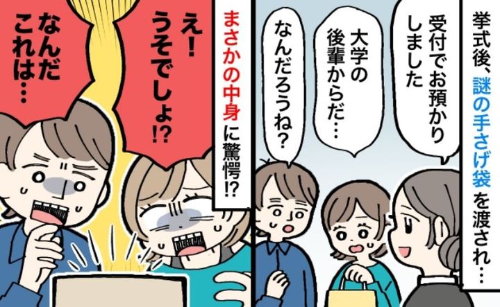 これは、私たち夫婦が結婚式後に体験した出来事です。式が終わるとスタッフさんから、参列者がくださったご祝儀を受け取りました。するとそれとは別に「受付でお預かりした」と大きめの手さげ袋を渡されたのです。差出人は私が招待した大学の後輩女性でした。まったく見当がつかず家で開けてみたのですが、その中身によって、夫と2人でかなり悩むことになり……。