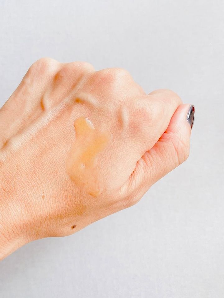 ビタミンCカラーの黄色のサラッとしたテクスチャー。肌になじませると、ムチッと肌が整う感覚。