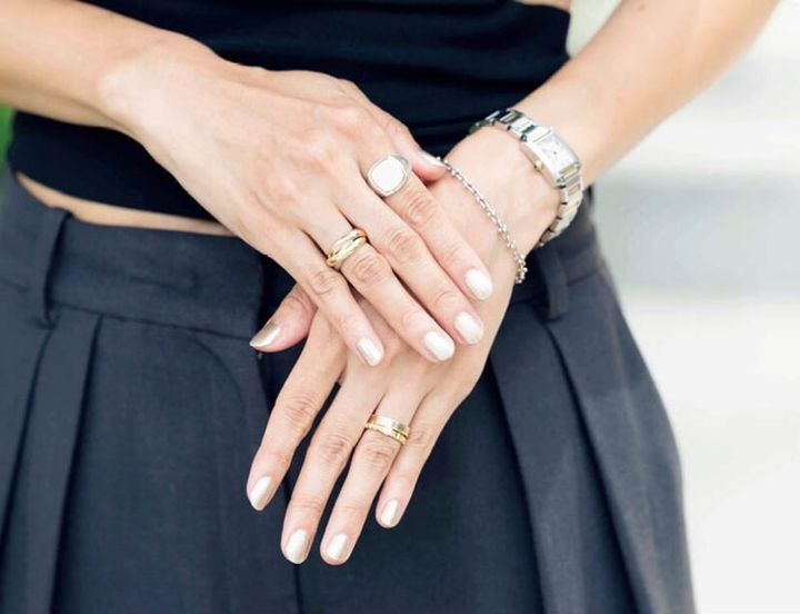肌の露出を抑える重ねづけアクセが主流。リングとブレスのコーデにも注目。特に、細バングルとボリュームブレスレットの重ねづけは露出の分量を減らしつつ、フェミニンさもアピールできる優秀テク。