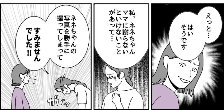 しかも今までに撮ったネネの写真は、義母の前ですべて消去してくれたそう。ハセガワさんの謝罪に誠意を感じた私は、これを受け入れることに。今後はママ友として、仲良くお付き合いをしていこうと思います。