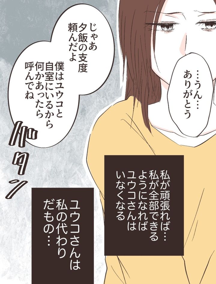 自分磨きが好きで自分にも妻のハズキさんにも妥協を許さないリヒトさんは、自分のルーティンや計画が崩れることをとても嫌がり、ハズキさんの家事に完璧を求めました。頑張っても頑張ってもダメ出しばかりされる毎日でハズキさんは次第に追い詰められていきました。リヒトさんはハズキさんが妊娠しても完璧を求め、つわりが酷くなったハズキさんが自分の希望に応えられないとわかるとハズキさんの代わりに家事をしてもらうといってユウコさんという女性を住み込みで雇いました。ユウコさんはハズキさんの入院中にリヒトさんがスポーツジムで出会った女性で、家事をしてもらっているうちに二人は男女の仲になっていました。ハズキさんが退院してからもユウコさんに家に居てほしいと考えたリヒトさんは、家事は代行サービスに任せて自分はリヒトさんの体のメンテナンスをするというユウコさんの提案を受け入れ、退院したハズキさんとリヒトさん、ユウコさんの3人の生活が始まりました。リヒトさんとユウコさんの距離の近さに違和感を覚えながらも我慢していたハズキさんは、自分が家事をできるようになればユウコさんはいなくなると思い夕食作りから家事を再開すると言ったところ、リヒトさんに「ユウコの分もお願い」と言われビックリ。ハズキさんが夕食の準備をしている間にユウコさんとストレッチをして体を整えると言うリヒトさんに我慢できず「もうユウコさんにお願いするのやめてもらえないかな?」とハズキさんは言いました。
