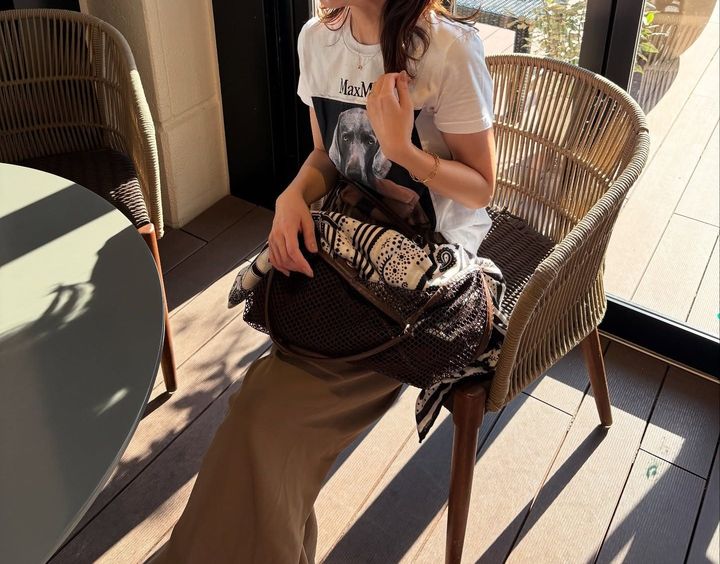 モード感漂うロゴTシャツに、落ち着いたブラウンのスカートを合わせたカジュアルシックな着こなし。Tシャツの白が顔まわりを明るく見せ、ブラウンが全体を大人らしくまとめて季節感を演出。秋まで活躍しそうなメッシュバッグをプラスして、軽やかさと季節感を両立。フラットサンダルで抜け感を添えた、リラックスムード漂うコーデです。