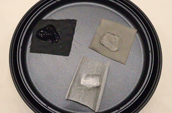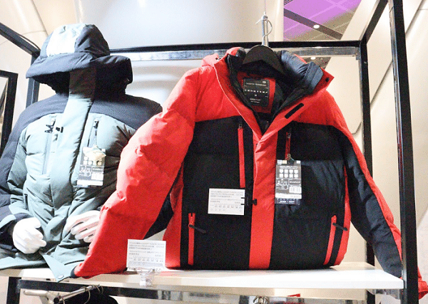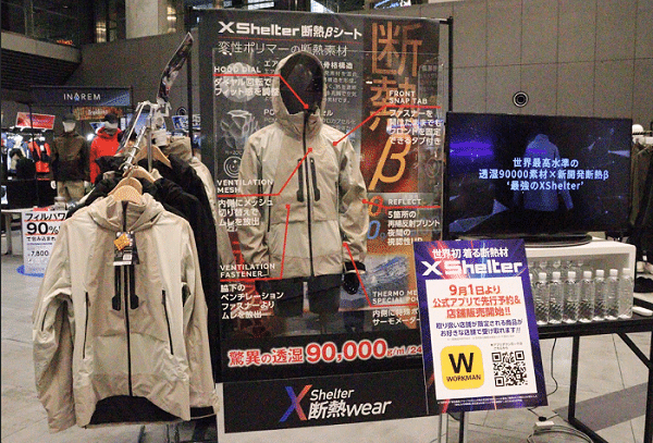 そのなかで開発されたのが、「着る断熱材」XShelterシリーズです。生地の性能を示すコーナーでは、ホットプレートの上に3種類の生地を敷き、その上に氷を置いて経過をみるデモンストレーションをやっていました。右上の生地がXShelter用に開発されたものですが、他の生地の上の氷が解け始めても、なかなか解けないことが視覚的にわかりました。