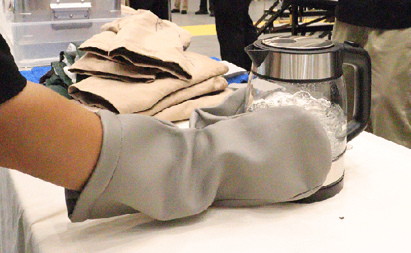 この生地で作ったミトンを着用して、沸騰状態の電気ポットを触りました。素手では少し触れただけで熱くて手を引っ込めるのですが、ぎゅっと握っても熱さは感じませんでした。