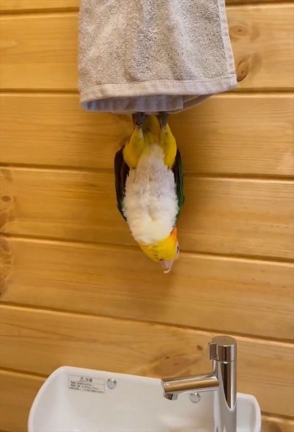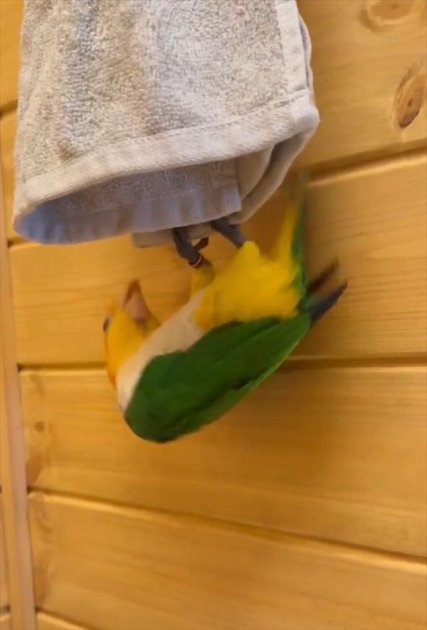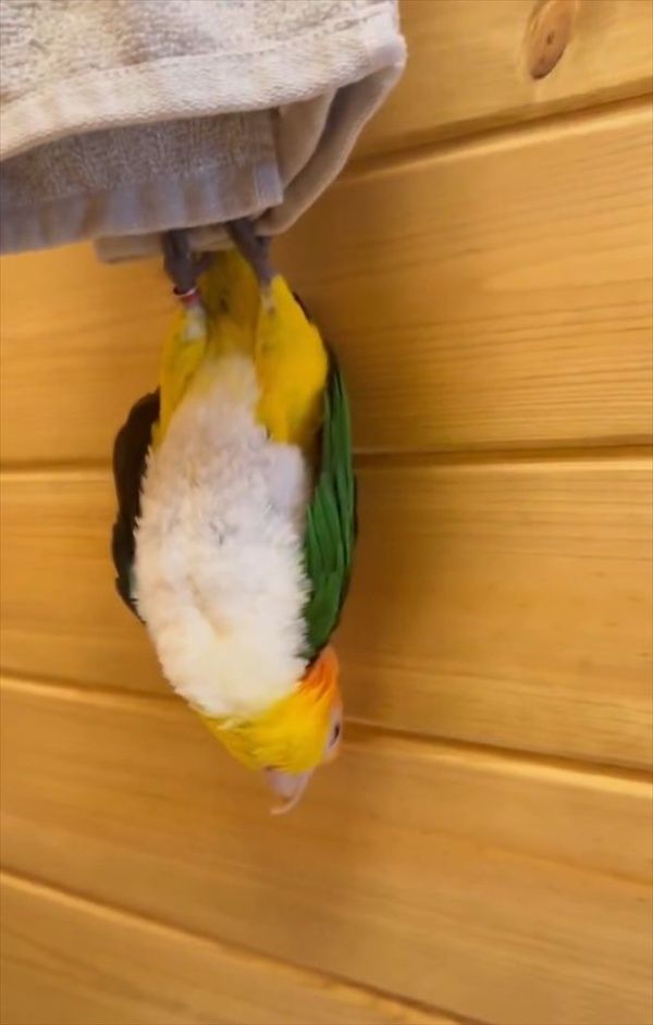 映像には、タオルにつかまり逆さになっているシロハラインコの『レオ』ちゃんの姿が。