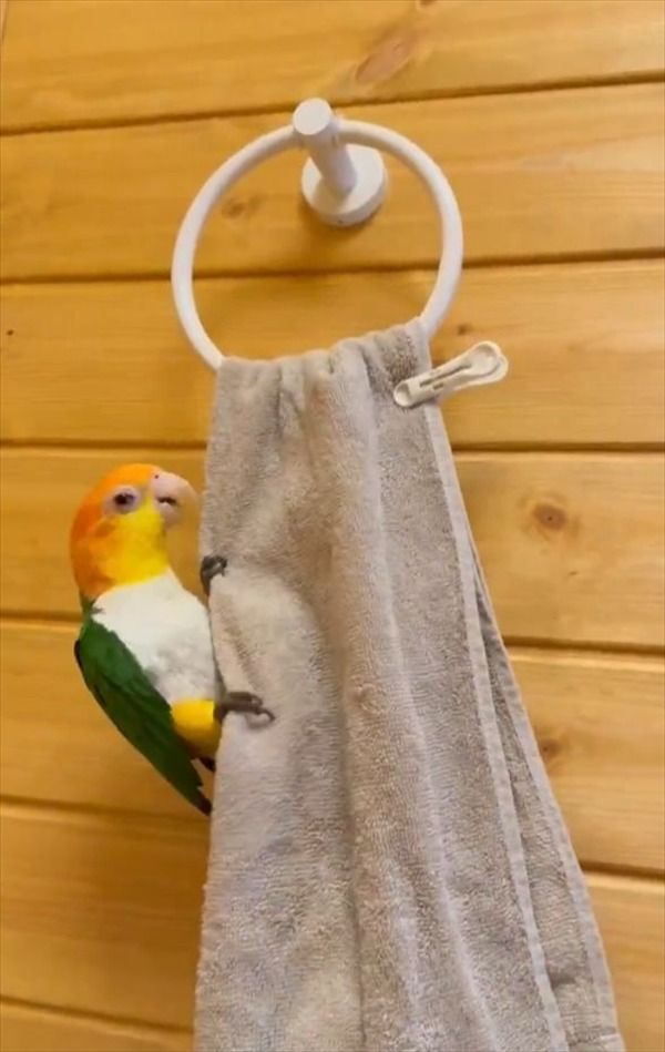 コウモリのようにタオルにぶら下がるインコのレオちゃんの姿は、こちらの投稿内の動画からご覧いただけます。