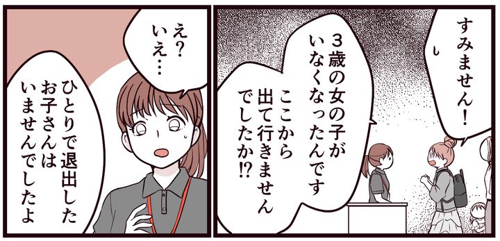 アカリは「すみません! 3歳の女の子がいなくなってしまったのですが、ここから出て行ったりしたところを見ていませんか!?」と、受付で確認しました。受付の人は子どもひとりでの退出はなかったと言います。