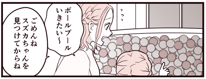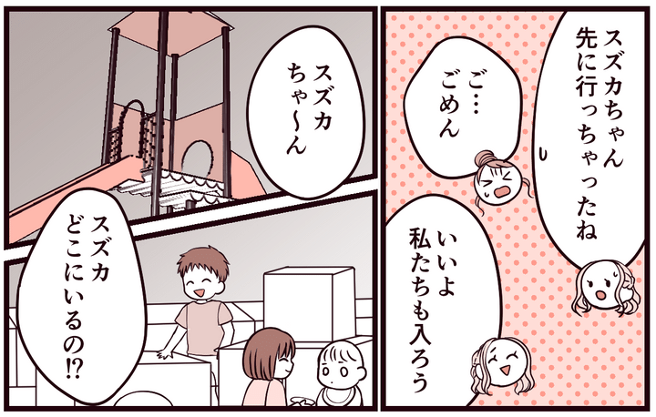 私たちが受付をしている間に、スズカちゃんは大人たちの間を通り抜けて、制止する言葉も聞かずに遊び場の中に入って行ってしまったのです。スズカちゃんは、近くで待っているだろうと思いましたが……受付をすませて遊び場の中に入ると、スズカちゃんは見えなくなっていたのです。