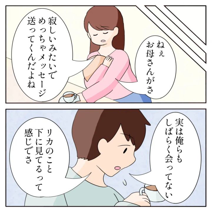 久しぶりにシュウトに会ったので、「ねぇお母さんがさ、寂しいみたいでめっちゃメッセージ送ってくんだよね」と伝えると、シュウトは「実は俺らもしばらく会ってない」と言いました。意外。あんなに溺愛されているから、実家に帰るのが楽しみなのかと思っていました。でもシュウトは「リカのこと下に見てるって感じでさ。」とうつむきました。