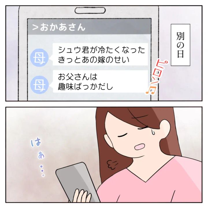 また別の日には、シュウトが冷たくなったとメッセージ。『あの嫁のせい』と、シュウトの妻リカちゃんに怒りの矛先をむけています。父は趣味の時間に没頭しているようなので、ひとりになった母は暇を持て余しているのでしょう。私は大きくため息をつきました。