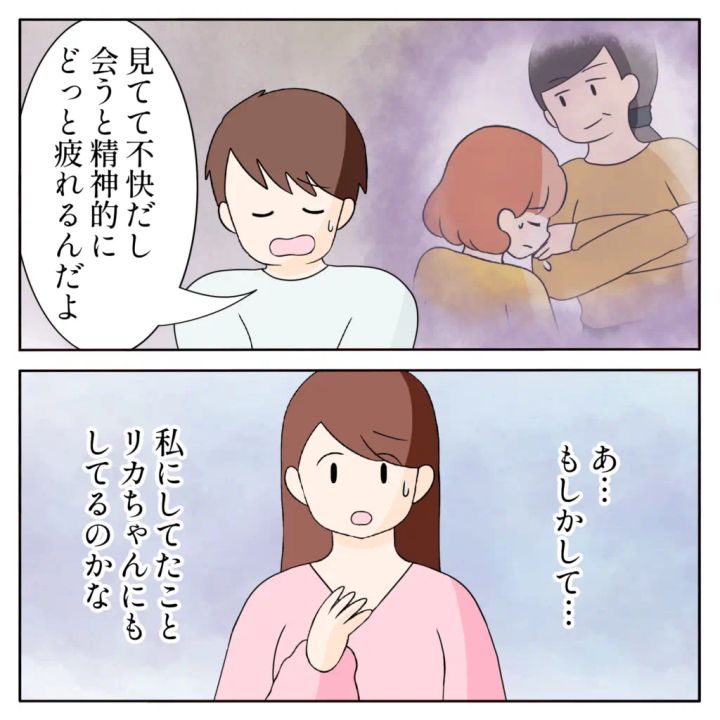 「見てて不快だし、会うと精神的にどっと疲れるんだよ」と愚痴りました。もしかして、母は私にしてたこと、リカちゃんにもしてるのかな。私はリカちゃんが心配になりました。