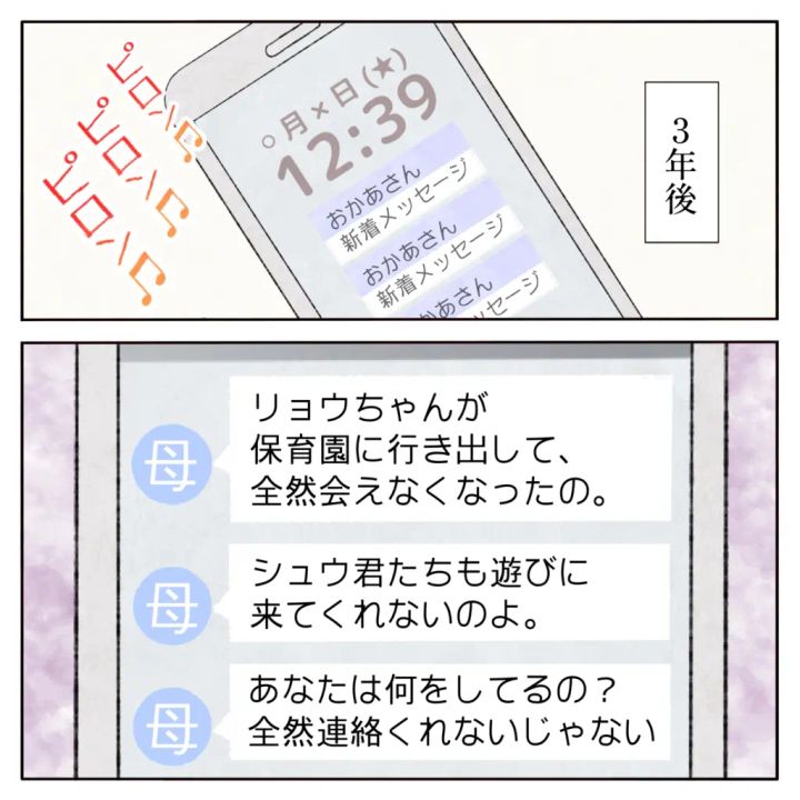 両親が初めて夫アキラに会ってから3年。私はアキラの実家に引越して幸せに暮らしていました。その頃から頻繁に母からメッセージが届くようになりました。リョウちゃんが保育園に行き出して全然会えあい、シュウ君たちが遊びに来ない、あなたは何してるの?全然連絡くれない、などなど。