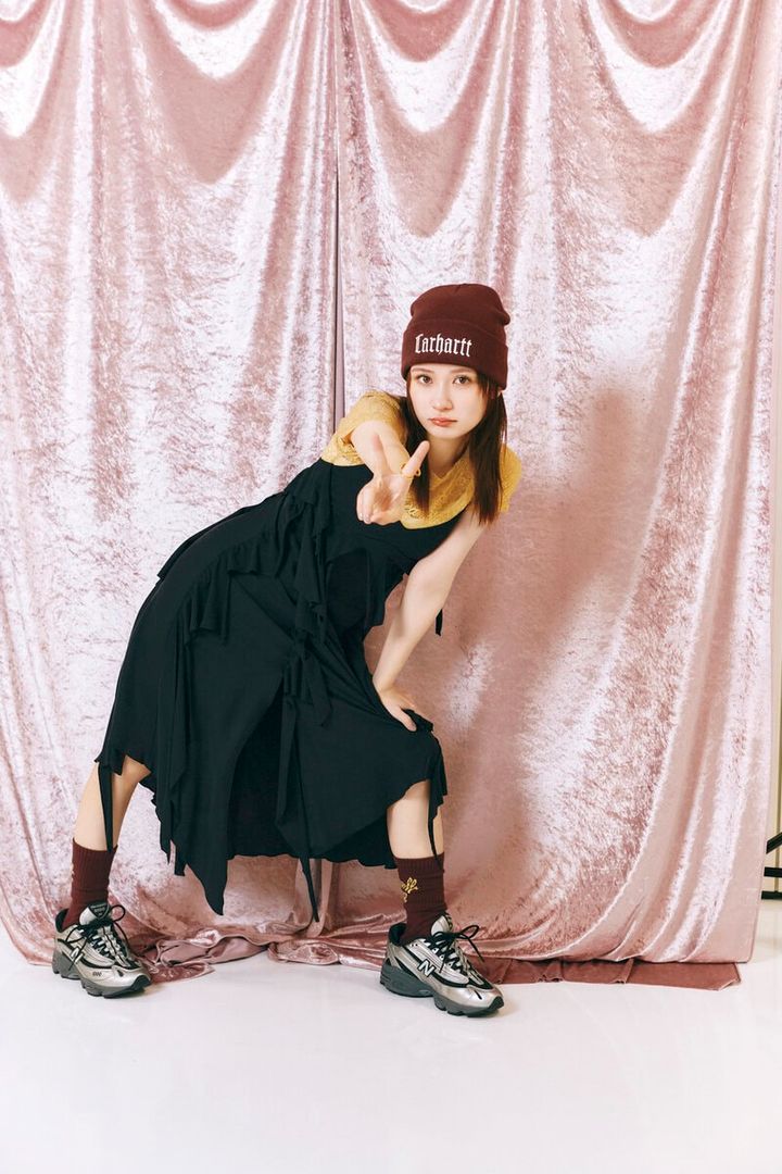 HATATシャツ¥7,997/スライ(バロックジャパンリミテッド)、スニーカー¥19,800(ニューバランス/ニューバランスジャパンお客様相談室)、ワンピース¥91,300(ディーゼル/ディーゼル ジャパン)、ニット帽¥7, 180、ソックス¥4,180/ともにカーハート WIP(カーハート WIP ストア ハラジュク)、リング¥2,420(アネモネ/サンポークリエイト)