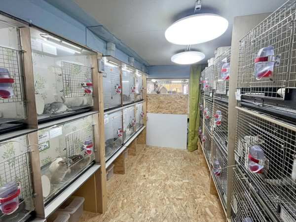 ペットショップ特有の動物臭も気にならず、とてもきれいスペースで約50匹のチンチラが飼育されています。家族で一緒のケージに入っているそうで、とっても仲良く微笑ましい。