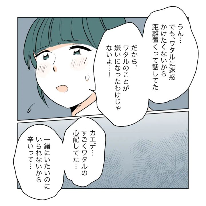 私はカエデの想いをワタルに伝えました。「ワタルに迷惑かけたくないから、距離送って話してた。だから、ワタルのことが嫌いになった訳じゃないよ!カエデ、すごくワタルの心配してた。一緒にいたいのにいられないから辛いって。」カエデがなかなかワタルに言い出せなかった気持ちを代弁したのです。