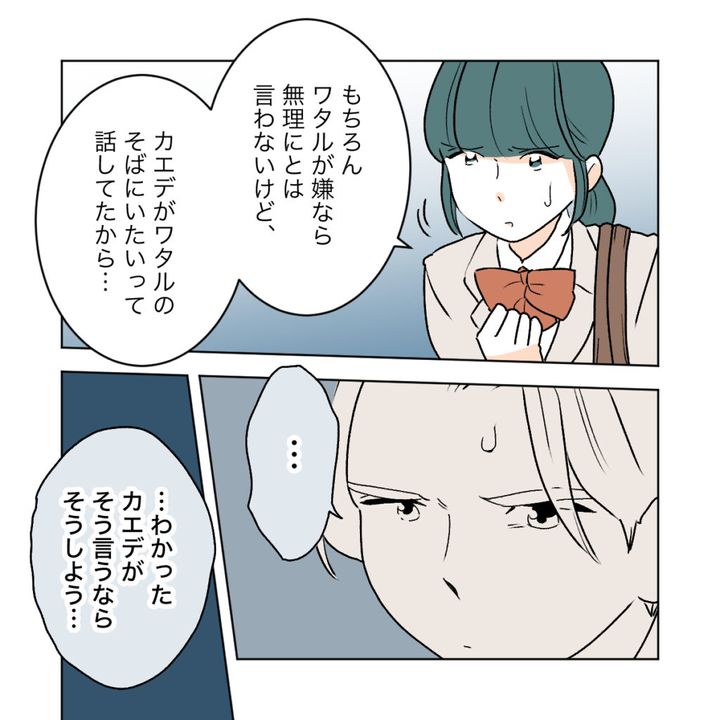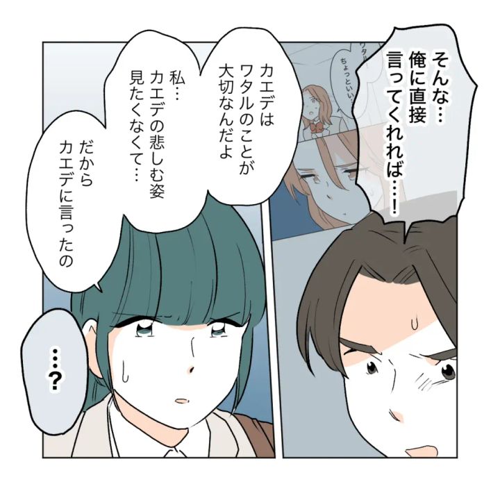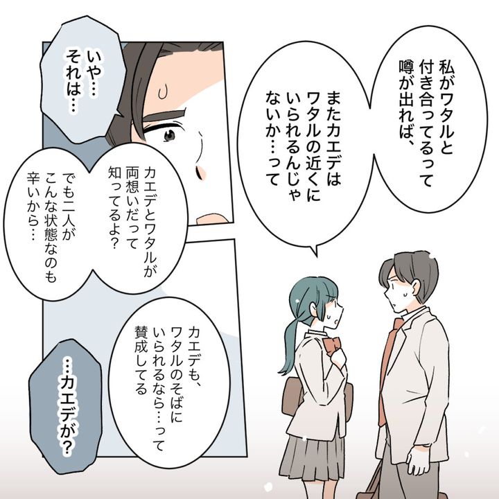 「私がワタルと付き合ってるって噂が出れば、またカエデはワタルの近くにいられるんじゃないか・・・って。」突拍子もない提案にワタルは「いや、それは・・・」と躊躇しましたが、私は「カエデとワタルが両想いだって知ってるよ?でも2人がこんな状態なのも辛いから・・・カエデも、ワタルのそばにいられるならって賛成してる」と、カエデと相談して決めたことだと強調しました。