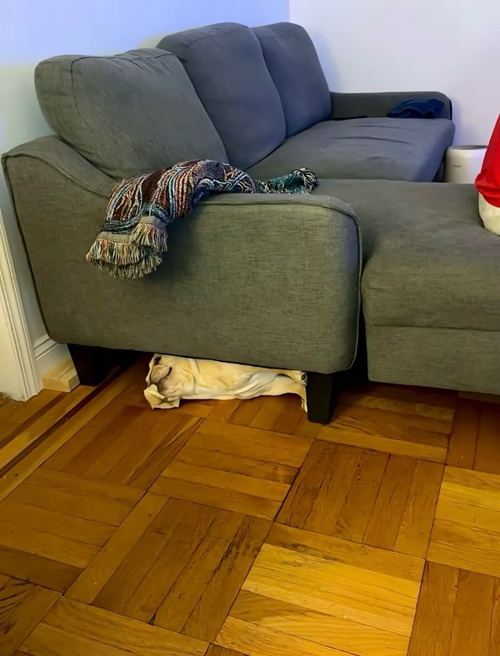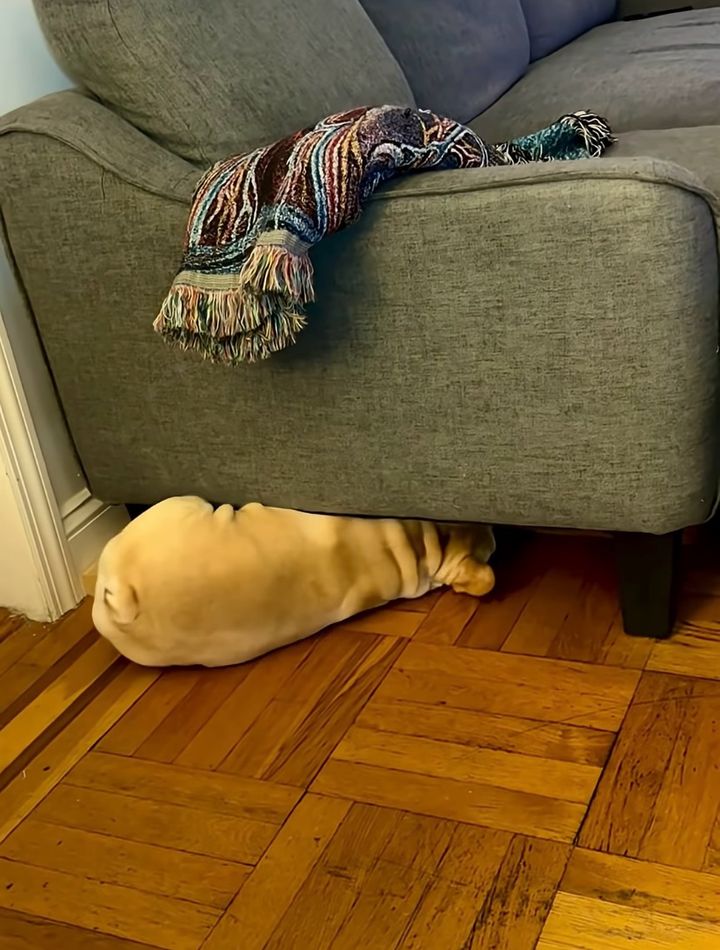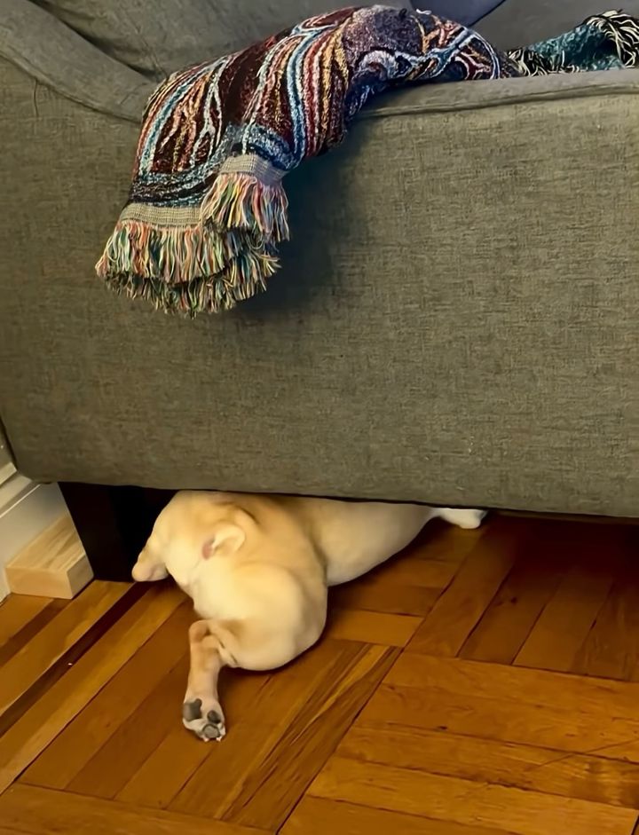 腹ばいになってなんとかソファの下に潜り込んだフレンチブルドッグ。 この子がこんな狭い場所に入り込んだのには、理由があったのです!