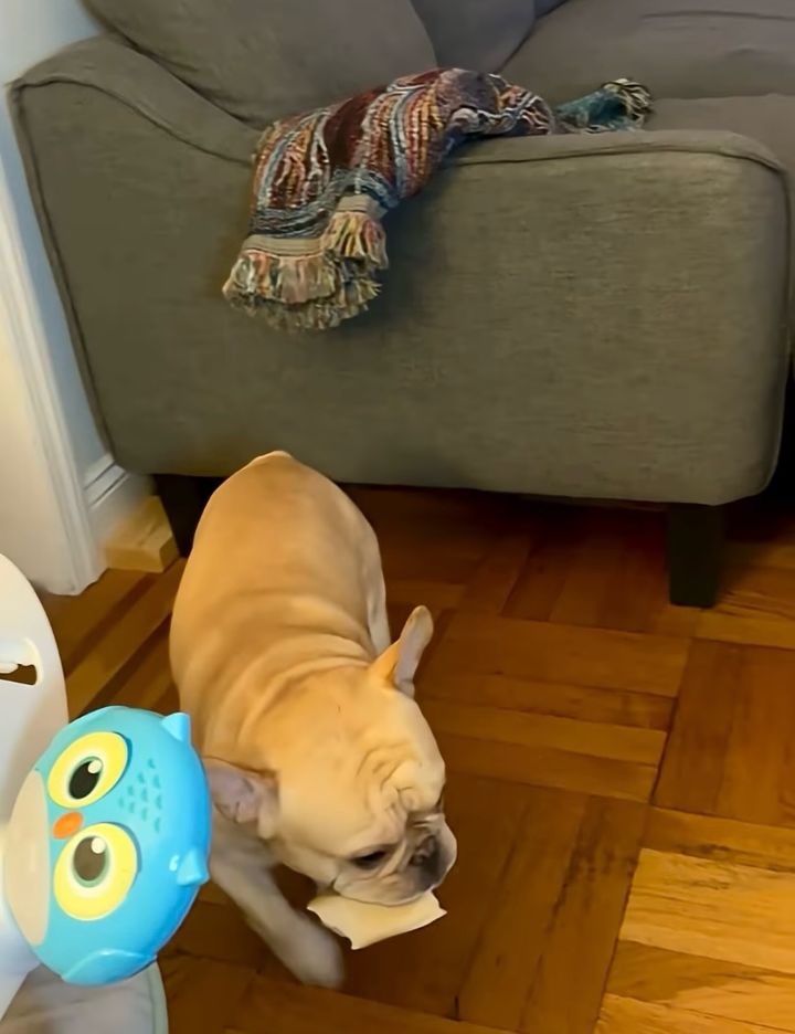フレンチブルドッグがソファの下に潜りこんだ理由。バタバタしながらお宝と一緒に這い出てきたぞ!!【アメリカ・動画】