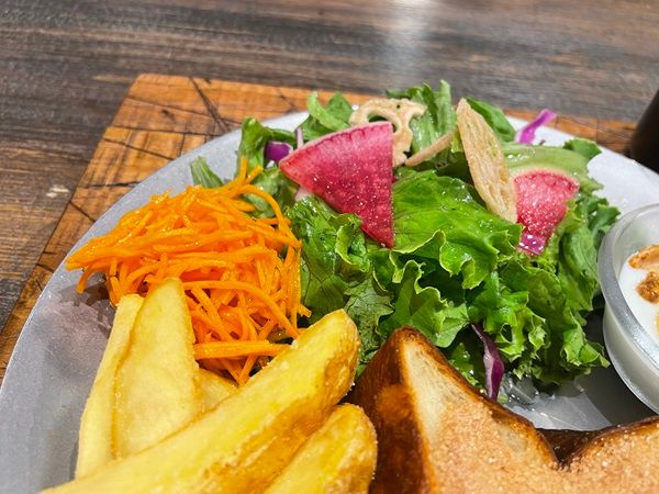 ポテトも油っぽくなく、ホクホクでじゃがいもの素材の美味しさが伝わります。またサラダはレンコンチップスに紫キャベツ、赤大根と色合いもよく、酸味がしっかりあるサッパリドレッシングでヘルシーに仕上げていました。胡椒が効いたニンジンのラペも甘酸っぱくて口休めに最適です。食後にグラノーラがトッピングされたヨーグルトで締めました。