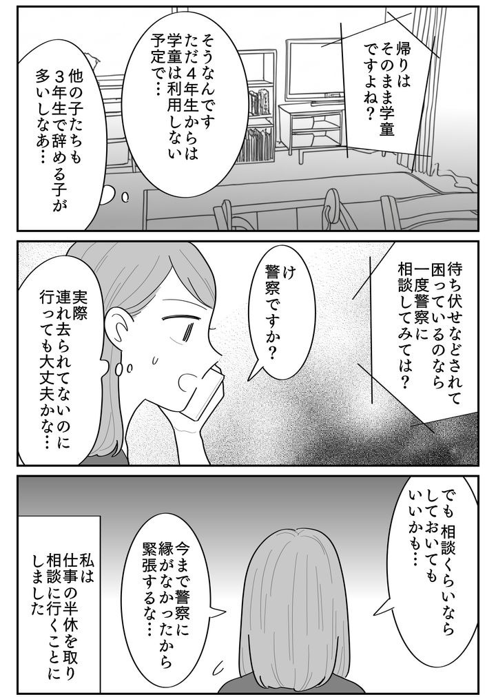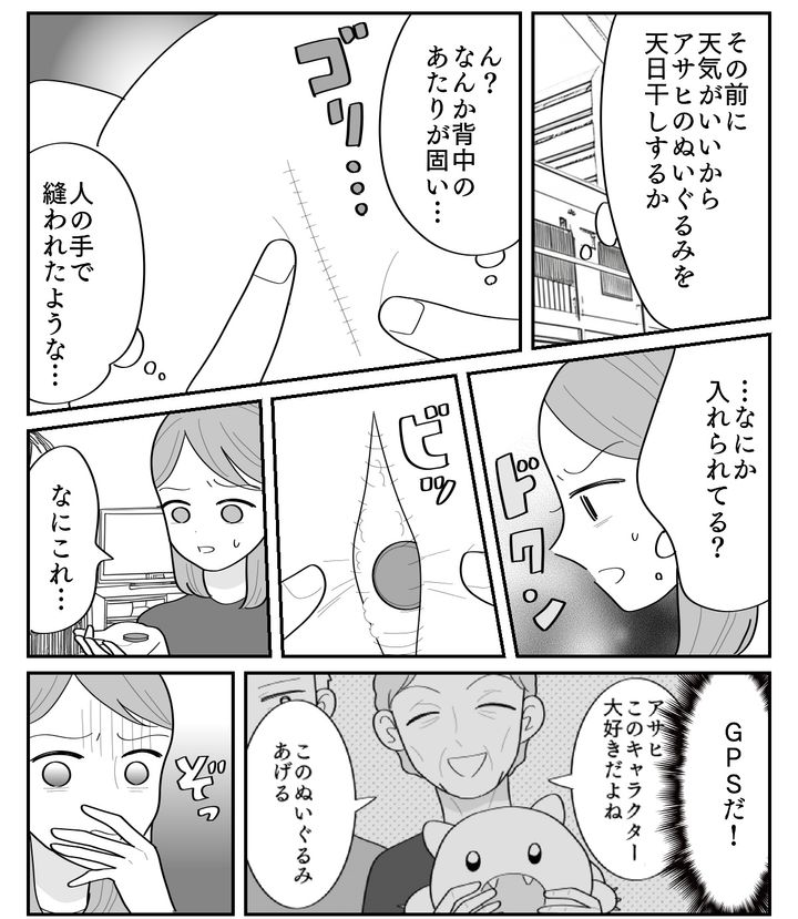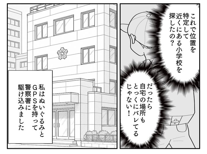 まさかアサヒがもらったぬいぐるみの内部にGPSが仕込まれていたなんて、想像もしていませんでした。ここにGPSの発信機があるということは、学校だけではなくすでに家の場所も知られているということ。常識や想像を超えた元義母の行動にたまらなく恐ろしくなった私は、すぐに警察へと駆け込んだのです。