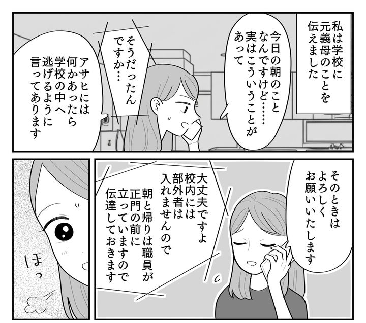 私はミキ。3年前に離婚し、フルタイムで働きながら息子のアサヒ(小3)を育てています。現在は2ヶ月に1回、父子面会の機会を設けています。面会にはアサヒの希望で私も同行しており、元夫の方は必ず元義母がついてきていました。しかし最近は住所を教えていないにもかかわらず、なぜかアサヒが元義母に学校のそばで待ち伏せされるという出来事が……。執着が度を超していて、このままだと元義母にアサヒが連れ去られる最悪の想像しかできません。