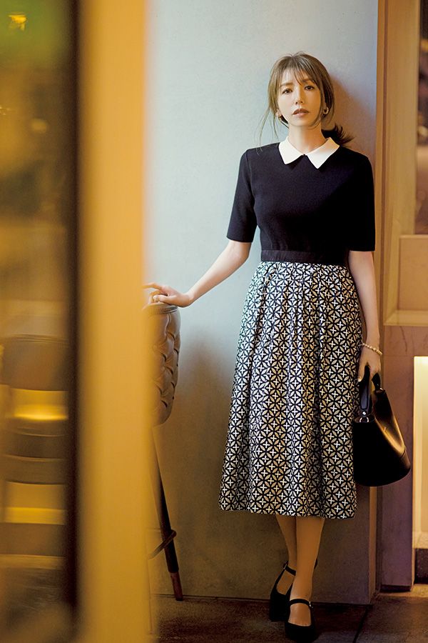 この秋は、ドレステリアのアイコン「オーバーラップサークルプリント」を取り入れたセットアップ見えワンピースもおすすめ。クラシカルなモノトーンの襟付きトップス×ヴィンテージライクなグラフィックのスカートの、THE今年なワンツーコーデがこれ1枚で♡