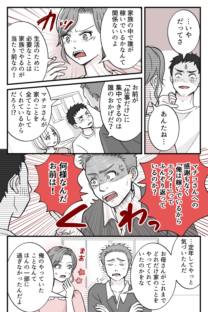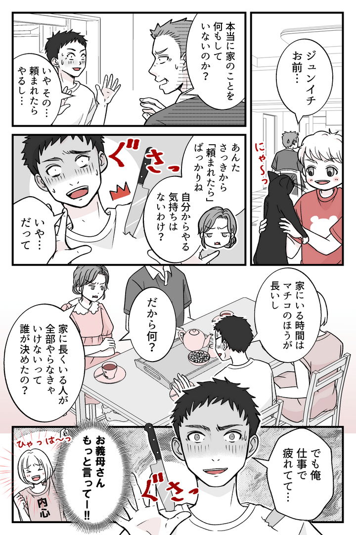 私はマチコ(30代)。夫のジュンイチ(30代)と息子のタクマ(4歳)と暮らすパート主婦です。夫はいわゆる「亭主関白」で「家のことは女の仕事」と考えています。夫は収入の多さを盾に家事や子育てに協力しません。そんな中、家族で義実家を訪ねると、亭主関白だったはずの義父がエプロン姿で料理していたのです! 退職後に料理を始めたという義父に、夫はかなり衝撃を受けます。しかも義父は昔から家事に協力していた事実もわかりました。義両親から、夫へのお説教タイムが始まります!