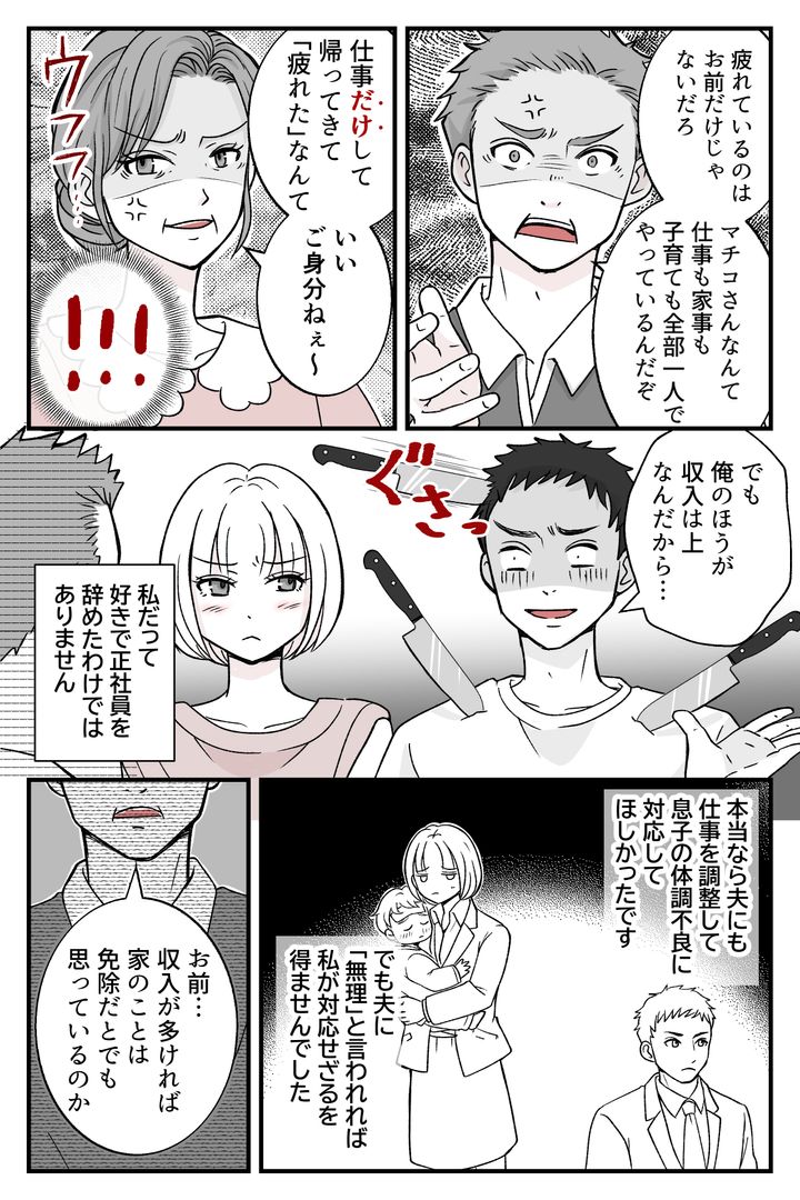とうとう収入のことを持ち出した夫。私だって好きで正社員を辞めたわけではありません。本当なら夫にも仕事を調整してもらい、息子の体調不良に対応してほしかったです。でも夫に「無理」と言われれば、私が対応せざるを得ませんでした。さすがに夫の言葉は聞き捨てならなかったようで、義両親のお説教はさらにヒートアップします。