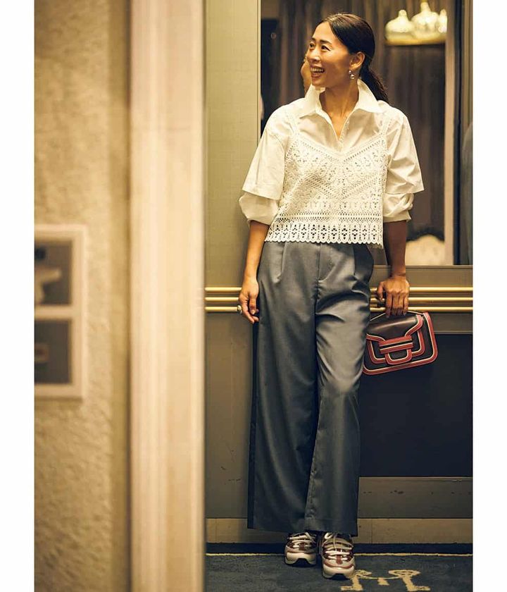キャミソール¥13,200 パンツ¥22,550(ともにアルページュストーリー プレスルーム) シャツ¥17,930(メゾンスペシャル/メゾンスペシャル 青山店) バッグ¥209,000 スニーカー¥124,300(ともにピエール アルディ/ピエール アルディ 東京) ピアス¥11,990〈ラブ・エージェイ〉 リング¥51,700〈バルブス〉(ともにZUTTOHOLIC)
