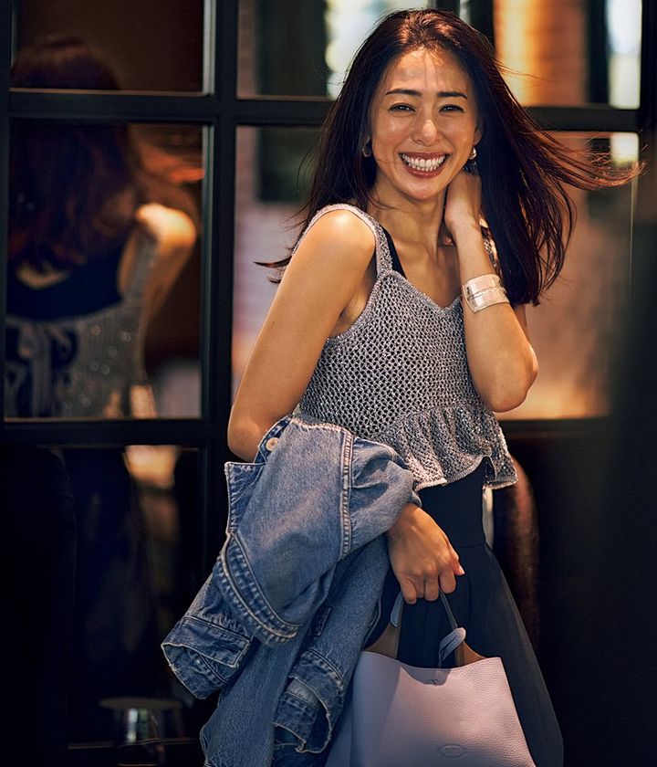 シルバーキャミソール¥14,960(FRAY I.D/FRAY I.D ルミネ新宿2店) 手に持ったデニムジャケット¥49,500(ニードバイヘリテージ/ゲストリスト) タンクトップ¥13,200(ティッカ) パンツ¥24,200(メゾンスペシャル/メゾンスペシャル 青山店) バッグ¥185,900(トッズ/トッズ・ジャパン) ピアス¥24,640〈バルブス〉 バングル¥29,700〈アドラル〉(ともにZUTTOHOLIC) リング¥33,000(プラウ)