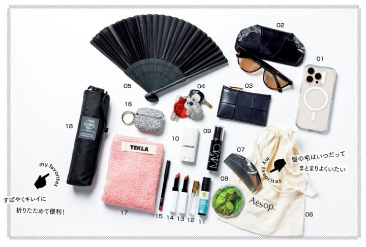 01シンプルなスマホケースが好き。02コーデのポイントになるキャットアイフレームのサングラスはルネッタバダ。03キャッシュレス派ですが、お札はこのボッテガ・ヴェネタのフラグメントケースにたたんで持ち歩きます。04コアラのチャームはオーストラリアのお土産。05この時期にマストな扇子。06コスメポーチは軽くたっぷり入るイソップの巾着。07サイズ感が持ち歩きに便利なラブクロムのヘアコーム。08鏡。09MiMCの日焼け止め。10スミデイのヘアバームは自然な仕上がりでしっかりまとまる。11プリマヴェーラのミントフレッシュロールオンはこめかみに塗って仕事中もリフレッシュ。12ネロリハーブで作ってもらったオリジナルの精油を使った香水。13・14カラーリップはアディクション。15NARSのリップライナー。16キラキラケースに入れたAirPods。17色が可愛いテクラのタオル。18シワにならず折りたたみやすいウラワザの日傘。