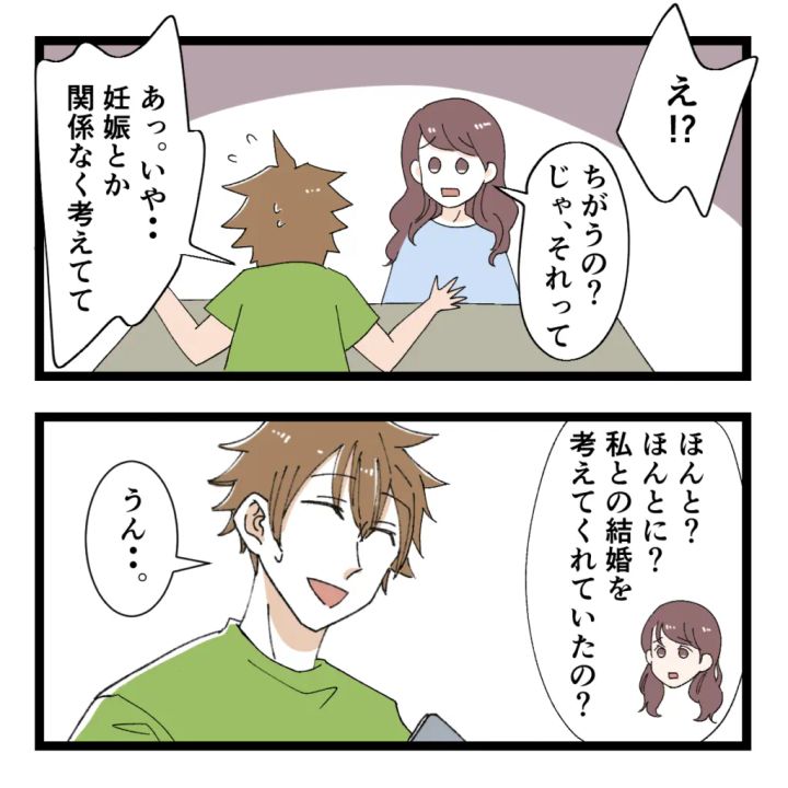 曖昧な関係が続いていたヒロトさんに彼女がいたと知った直後に妊娠が発覚したアユミさん。恐る恐るヒロトさんに妊娠を打ち明けようとすると、ヒロトさんがスマホでブライダルフェアについて調べているのが偶然見えました。アユミさんは、ヒロトさんが妊娠に気付いて結婚について考えてくれているのかと思い「もしかして私が妊娠してたって知ってた?」と聞きますが、ヒロトさんは「えっ!?」と驚いた表情。「ちがうの?じゃ、それって」と困惑するアユミさんに、焦ったように「あっ。いや・・妊娠とか関係なく考えてて」と言うヒロトさん。「ほんと?ほんとに?私との結婚を考えてくれていたの?」と驚くアユミさんに、ヒロトさんは「うん・・」と笑顔で答えました。