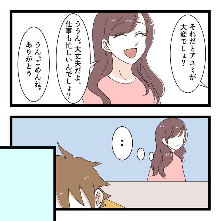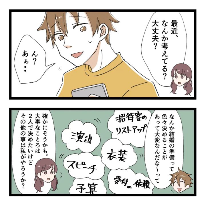 「それだとアユミが大変でしょ?」と遠慮するヒロトさんに「ううん。大丈夫だよ。仕事も忙しいんでしょ?」と一人でできる準備は快く引き受けたアユミさん。その後も順調に結婚の準備は進んでいきましたが、やはりヒロトさんは時折考え込むような様子があり、アユミさんは気になりました。