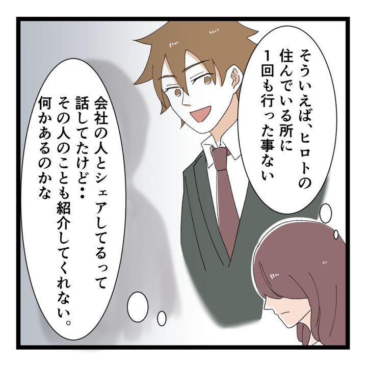 「そういえば、ヒロトの住んでいる所に1回も行った事ない。会社の人とシェアしてるって話してたけど・・。その人のことも紹介してくれない。何かあるのかな」ヒロトさんの様子が気になっていたアユミさんは、結婚も決まったのにヒロトさんが住んでいるところも同居している人も紹介してくれないことを疑問に思い始めました。