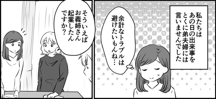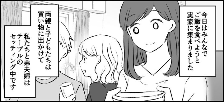 私はサヤカ(35)。旦那のコウスケ(37)と、コウタ(小3)とアサシ(幼稚園児)の4人で暮らしています。今日は父と母が、私と弟・ノリユキ(32)家族に「ご飯を食べよう」と提案してくれて実家に集まりました。父と母がご飯を作ってくれるとのことで、それを聞いた私の息子たちと、弟の息子ゴウくん(小1)は、両親と買い物へ出かけて、私たち夫婦と弟夫婦が居残りです。当たり障りのない雑談をしながらテーブルのセッティングなどをしていたのですが……。