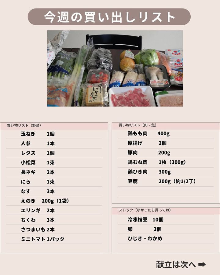 Instagramに投稿されている買い出しリスト付きの献立と料理写真には、週1回のまとめ買いで月~金曜日まで食材を無駄なく活用しながら、夜ごはんを手間なくおいしく作れるアイデアが詰まっていて、日々の献立に悩んでいる方にもおすすめです。